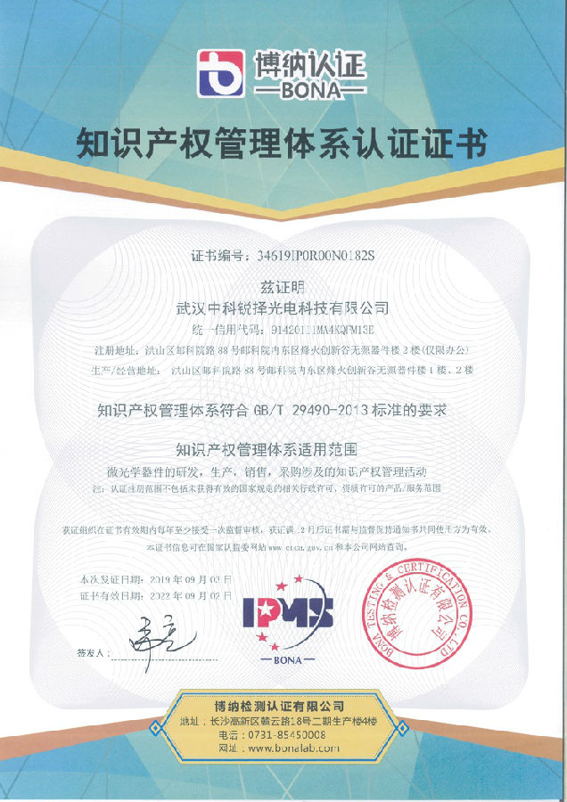 熱烈祝賀武漢中科銳擇光電科技有限公司于2019年9月獲得知識(shí)產(chǎn)權(quán)貫標(biāo)認(rèn)證證書(shū),這意味著中科銳澤在知識(shí)產(chǎn)權(quán)領(lǐng)域獲得到重要認(rèn)可,在知識(shí)產(chǎn)權(quán)方面得到進(jìn)一步規(guī)范和在綜合競(jìng)爭(zhēng)力得到進(jìn)一步提升。
