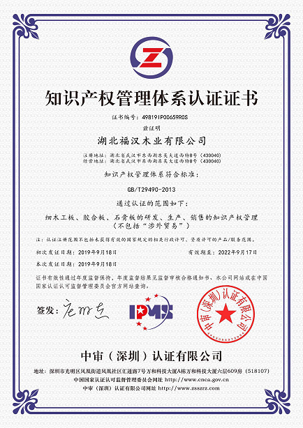 熱烈祝賀湖北福漢木業(yè)有限公司于2019年9月獲得知識(shí)產(chǎn)權(quán)貫標(biāo)認(rèn)證證書,這意味著湖北福漢木業(yè)在知識(shí)產(chǎn)權(quán)領(lǐng)域獲得到重要認(rèn)可,在知識(shí)產(chǎn)權(quán)方面得到進(jìn)一步規(guī)范和在綜合競(jìng)爭(zhēng)力得到進(jìn)一步提升。